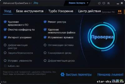![]() Advanced SystemCare - программа, включающая в себя множество модулей для оптимизации, настройки и повышения производительности компьютеров, находящихся под управлением операционными системами Windows 2000/XP/Vista/7/8. Благодаря возможностям программы вы сможете очистить ПК от шпионского и рекламного ПО, обнаружить и заранее устранить возможные угрозы и бреши в системе безопасности ОС, исправить ошибки в системном реестре, очистить временные и ненужные файлы, управлять списками автозагрузок, оптимизировать работу систем. Благодаря возможностям Advanced SystemCare вы сможете очистить ПК от шпионского и рекламного ПО, обнаружить и заранее устранить возможные угрозы и бреши в системе безопасности ОС, исправить ошибки в системном реестре, очистить временные и ненужные файлы, управлять списками автозагрузок, оптимизировать работу системы. Возможности программы: •Увеличение производительности и надежности системы •Мощная дефрагментация и оптимизация жестких дисков •Очистка и оптимизация системного реестра •Автоматическая работа в фоновом режиме •Защита системы от шпионского и вредоносного ПО •Быстрая и полная очистка жестких дисков от мусора •Улучшение работы вашего ПК •Исправление множества системных ошибок •Многоязычный интерфейс (включая русский!) Что нового в версии 6.1.9.220: Добавленный Центр Действия, чтобы гарантировать безопасность PC и лучшую работу Добавленная очистка для DivX Player 9.0, Norton AntiVirus 20.2.0.19, Spybot Search & Destroy 2.0, Adobe Reader 11.0, WinPatrol 26.0, TeamViewer 8.0, ZoneAlarm Free 11.0, Google Earth 7.0, Google Chrome 23.0, Skype 6.0, etc. Улучшенный Модуль PC для более умного контроля PC Улучшенная работа в Malware RemovalЈ¬Disk ScanЈ¬System OptimizationЈ¬Disk Defragment, и интернет-Повышение Улучшенный Пользовательский Интерфейс для более легкого и более простого использования Улучшенная Панель инструментов для более простого и более эффективного обслуживания Обновленная база данных для Перемещения по Защите, менеджеру по Драйверу, Зачистке Частной жизни Обновленный Неустановщик IObit с улучшенным UI и панелью инструментов удаляет способность Добавленные более поддержанные языки Исправленные ошибки в предыдущей версии! Установка: 1.Отключить интернет. 2.Установить программу 3.Ввести серийный номер Закрыть программе выход в сеть,с помощью фаервола ,или В C:\WindowsSystem32\drivers\etchosts добавляем строчку: 127.0.0.1 Операционная система: Windows XP, Vista, 7, 8 Процессор: Процессоры AMD или Intel с тактовой частотой от 1 ГГц и выше Память: от 256 МБ Видеокарта: Видеоадаптер с памятью от 128 МБ и выше Свободное место на ЖД: 20,5 МБ Название: Advanced SystemCare Pro v6.1.9.220 Final Год выпуска: Январь 2013 Платформа: Windows х64-х86 Язык интерфейса: Мультиязычный (русский присутствует) Лекарство: Присутствует Размер: 20.5 Мб Скачать Advanced SystemCare Pro v6.1.9.220 Final (Январь 2013)  Цитата