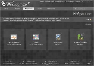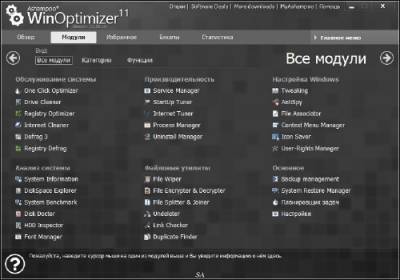 Обзор модулей для обслуживания системы: One-Click Optimizer: Быстрая оптимизация системы одним кликом. Drive Cleaner: Ищет и удаляет ненужные файлы. Registry Optimizer: Ищет и удаляет ненужные или повреждённые элементы реестра. Internet Cleaner: Удаляет следы работы в Интернете. Defrag 3: Дефрагментация жёстких дисков (Проактивная дефрагментация и дефрагментация во время загрузки) НОВИНКА Registry Defrag: Анализирует и дефрагментирует реестр Windows®.