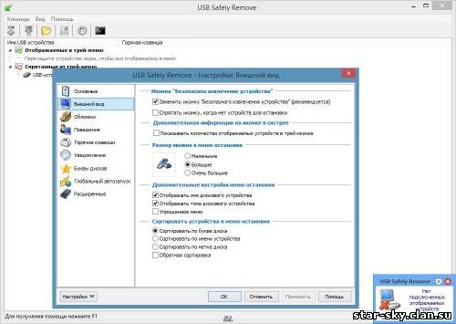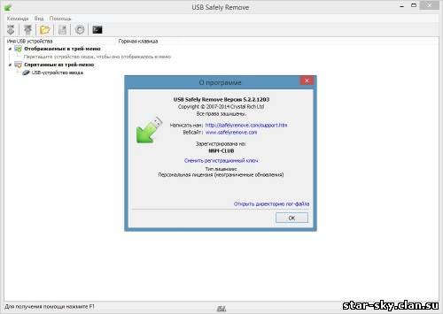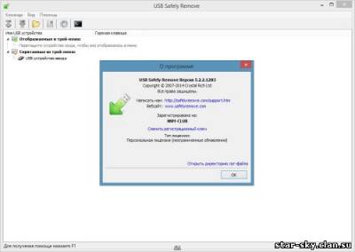 Безопасное извлечение в один клик. Просто подведите курсор мыши к иконке в системном трее, и появится удобное и красивое меню остановки устройств; Один клик по устройству и оно безопасно извлечено! Обратите внимание на понятные имена устройств; USB Safely Remove определяет истинные имена устройств. Это позволяет отключать именно нужное Вам устройство! "Устройство не может быть остановлено прямо сейчас". Когда устройство не может быть остановлено, то USB Safely Remove показывает, какие программы или процессы заблокировали его. А также, позволяет закрыть эти процессы одним кликом. Избавьтесь от лишнего. Теперь Вы можете управлять устройствами прямо из меню! Просто щелкните правой кнопкой мыши по устройству и Вы сможете открыть Exlorer с его содержимым, убрать его из меню, или переименовать его Обожаете клавиатуру. Используйте горячую клавишу (Win+S по умолчанию) для отображения меню остановки, и последующей работы с устройствами, с помощью клавиатуры. Более того, Вы можете включить опцию "Stop immediatelly", и программа будет останавливать Ваше устройство, если нет других подключенных видимых устройств. Свойства устройства. Здесь можно изменить имя устройства, загрузить для него картинку, или назначить горячую клавишу. Извлекайте красиво. Для устройства можно назначить одну из чудесных стандартных иконок или загрузить свое собственное изображение (JPG, PNG, BMP, ICO и другие форматы поддерживаются). Вы уникальны. Поэтому, USB Safely Remove позволяет изменить множество аспектов его поведения, чтобы Вы могли приспособить программу под свой вкус. Например, можно заставить программу скрывать иконку из системного трея, когда в меню нет ни одного устройства. Не можете найти свое устройство? Откройте главную форму. Просто перетяните устройство из секции "Hidden" в "Displayed", чтобы с ним снова можно было работать из меню остановки. Погрязли в рутине? Автоматизируйте! USB Safely Remove имеет мощную командную строку, которая позволяет смотреть устройства, отключать, смотреть, кто их мешает отключить. Например, Вы можете использовать командную строку для автоматического отключения устройств, зашифрованных с помощью True Crypt. Обилие новых иконок. Мы дополнили наш комплект иконок устройств множеством чудесных иконок. Улучшения и исправления в версии 5.2.2: Папковые точки монтирования отображается в полную длину (а не обрезанными, как раньше) Диски кард-ридера отображаются даже если отключена опция "Отображать тома дискового устройства" Упрощено создание файлов скинов. Теперь, цвета задаваемые в них, имеют обычный web-формат. Системный SATA диск ранее отображался в списке по умолчанию. Теперь он отображается только когда включена опция "Отображать все дисковые устройства" Теперь программа не добавляет себя в автозагрузку Windows при каждом запуске, она делает это только по необходимости. Поэтому если у вас установлен монитор автозагрузки он более не будет выдавать предупреждения при каждой загрузке Windows. Исправлено: Расширенное логгирование было включено по умолчанию Исправлено: Программы автозапуска вызывались до изменения букв дисков (например для зафиксированных букв дисков) и из-за этого они могли быть запущены дважды. Исправлено: Меню устройств отображалось когда пользователь запускал Диспетчер Задач (в Windows 8) или диалог изменения иконок в трее (Win 7, 8) Исправлено: другие незначительные ошибки