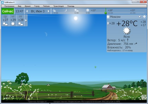 YoWindow - это монитор погоды. Программа отображает пейзаж, изменяющийся в зависимости от погоды, дневного освещения и времени года. Программа исправно отображает все возможные погодные явления: облака, дождь, снег, ветер, туман, грозу, а также солнце, луну и звезды. По сути YoWindow это модель обычного окна. Но в YoWindow у Вас есть возможность перемотать время вперед и заглянуть в будущее - увидеть прогноз погоды в нужный момент времени. В настройках YoWindow можно включить программу в автозапуск, выбрать для отображения информационные панели (интерактивная временная шкала, панель прогноза, инспектор, активировать анимацию погодной картины). Если нас интересует не только температура воздуха, то на экран следует вывести информацию о диапазоне температуры (какая она есть и какая она по ощущению), картинке неба, ветре, давлении, влажности, количестве осадков, видимости, времени восхода и заката, долготе дня и фазе луны. Также настраивается количество дней для отображения прогнозов, пейзаж (по умолчанию это “Деревня”), единицы измерения (фаренгейты, цельсии, мили, метры, узлы и прочее). Главные особенности: • Полный контроль погоды. • Прогноз погоды именно в то время которое Вам нужно. • Текущая температура рядом с системными часами. • Персональная поддержка метеостанции Установка: Установить программу, зарегистрировать серийником из key.txt Операционная система: Windows 8, 7, Vista, XP Процессор: процессор с тактовой частотой 1 гигагерц (ГГц) или выше Память: 256 MB Видеокарта: от 128 МБ Свободное место на ЖД: 10.8 MB Название: YoWindow Unlimited Edition 4 Build 1 Final Год выпуска: 2014 Платформа: х86/х64 Язык интерфейса: Мульти,русский Лекарство: Присутствует Тип лекарства: Лицензионный ключ Тип файла: .rar Размер: 19,09 Мб Скачать YoWindow Unlimited Edition 4 Build 1 Final (2014) Multi,Rus Цитата